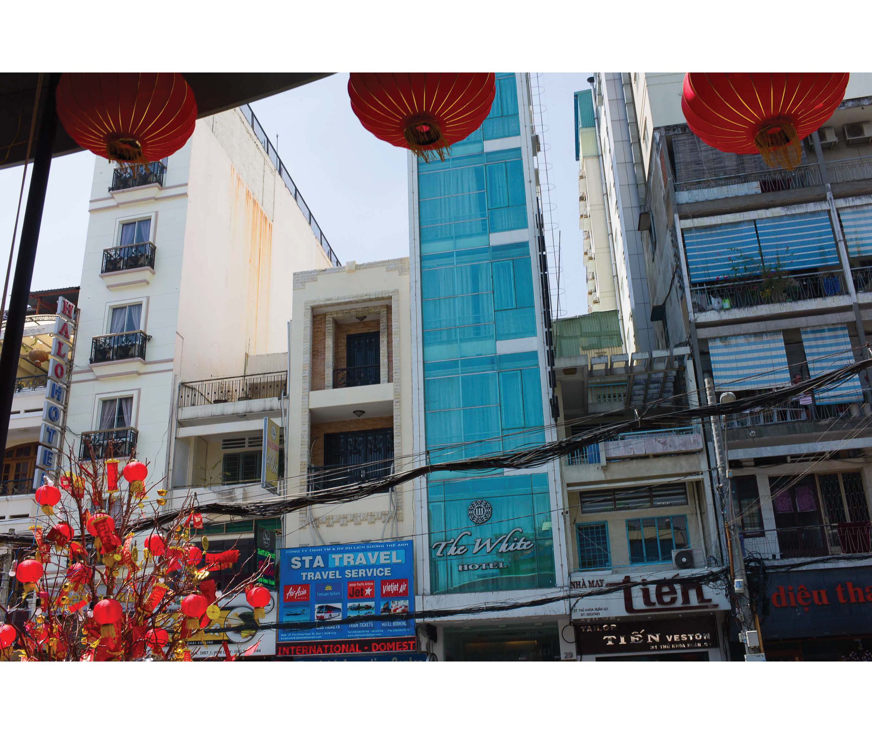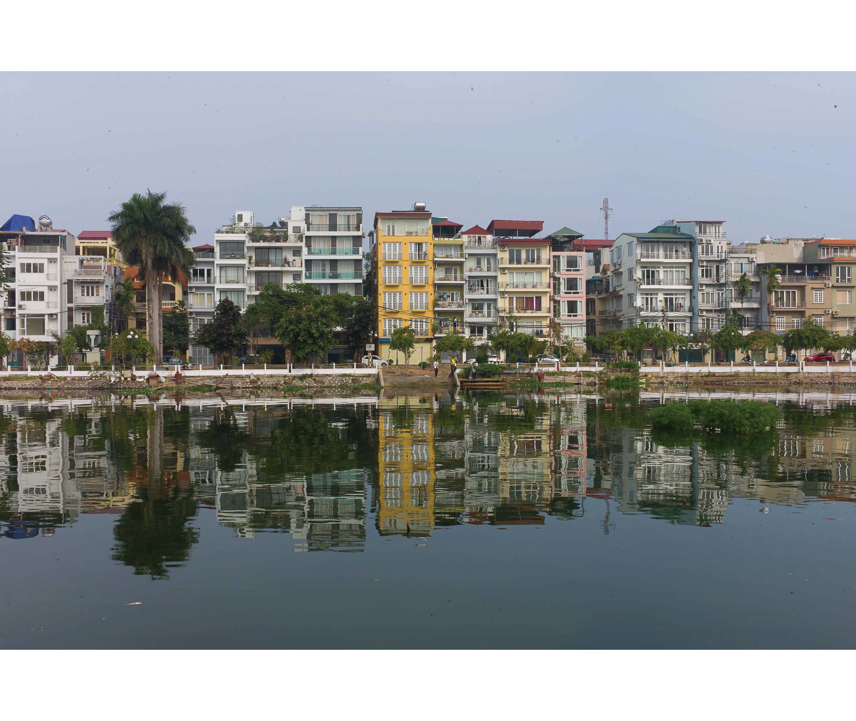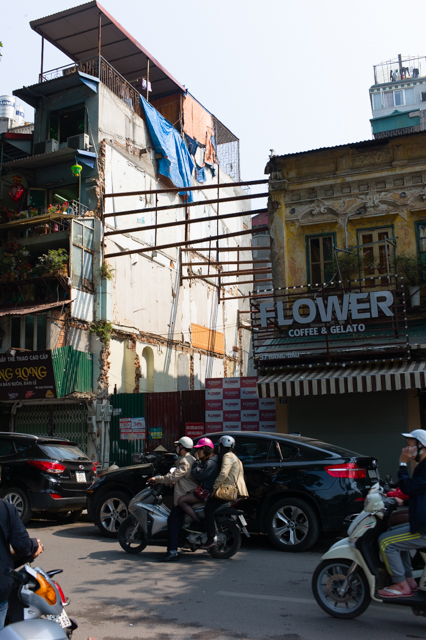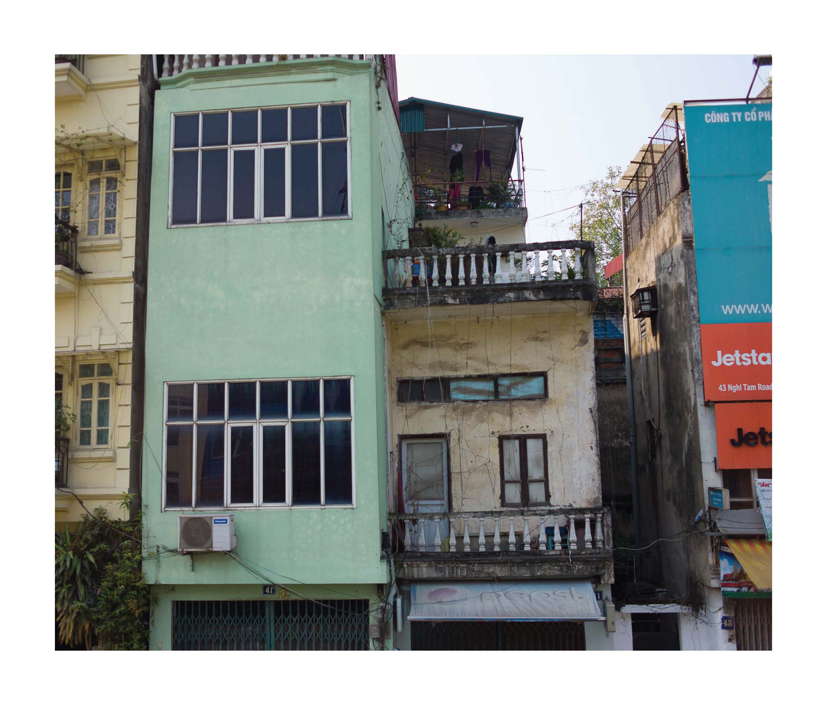 The narrow “tube houses” [nhà ống] are a striking feature of Vietnamese urban architecture. They are typically three to four meters (10 to 13 feet) wide. Some of the older tube houses in Hanoi’s Old Town, which were often inhabited by several families, are up to 100 meters deep, while newer tube houses can reach as high as twelve storeys. Tube houses are said to be an amalgam of Vietnamese and French colonial stylistic elements.